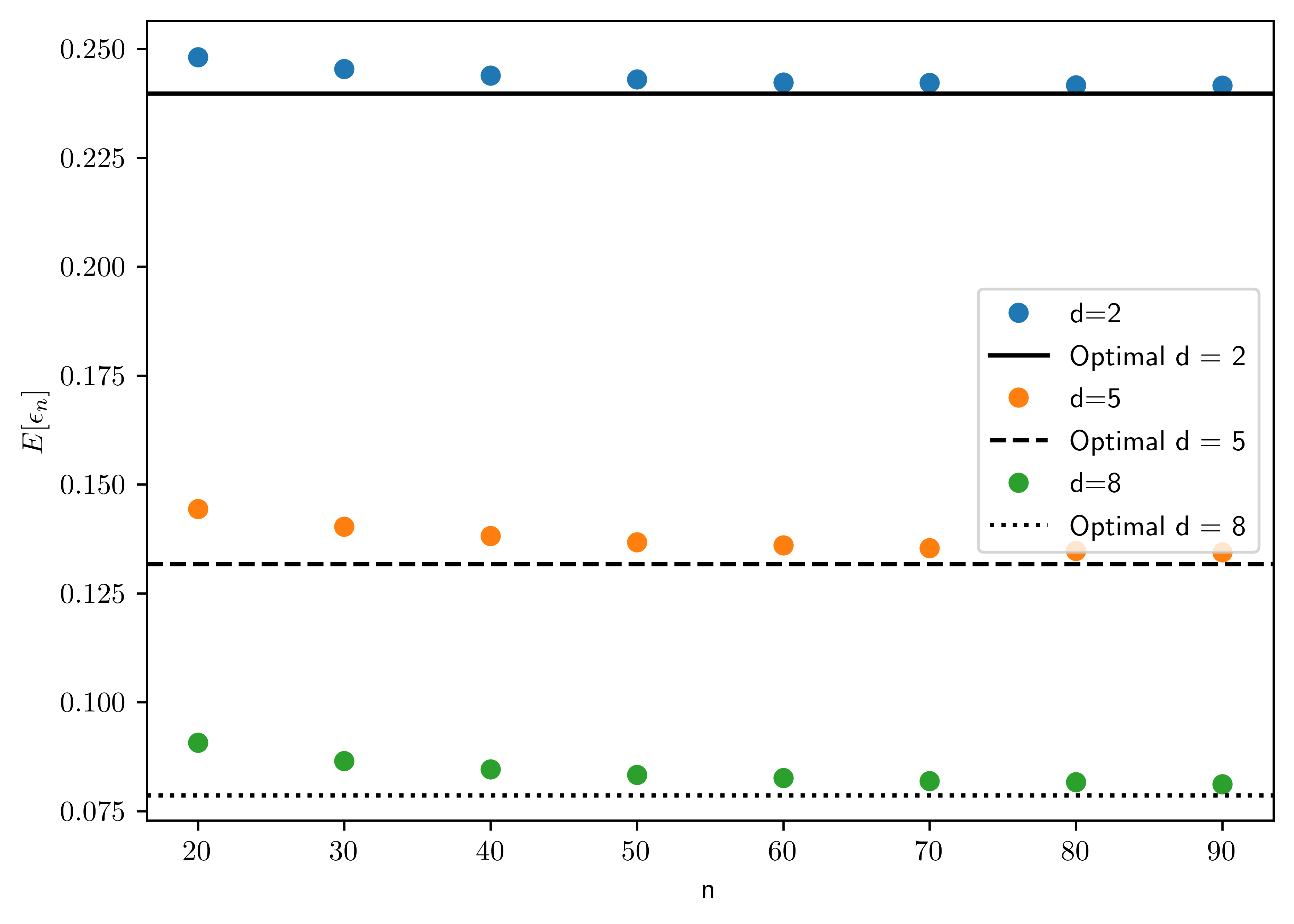 Using the synthetic data model in Section A8.1 for the homoskedastic case with \(\mu_0 = (0,\dots,0)\), \(\mu_1=(1,\dots,1)\), \(P(Y=0)=P(Y=1)\), and \(k=d\) (independent features), generate a large number (e.g., \(M=1000\)) of training data sets for each sample size \(n=20\) to \(n=100\), in steps of \(10\), with \(d=2,5,8\), and \(\sigma=1\). Obtain an approximation of the expected classification error \(E[\epsilon_n]\) of the nearest centroid classifier in each case by averaging \(\epsilon_n\), computed using the exact formula (3.13), over the \(M\) synthetic training data sets. Plot \(E[\epsilon_n]\) as a function of the sample size, for \(d=2,5,8\) (join the individual points with lines to obtain a smooth curve). Explain what you see.