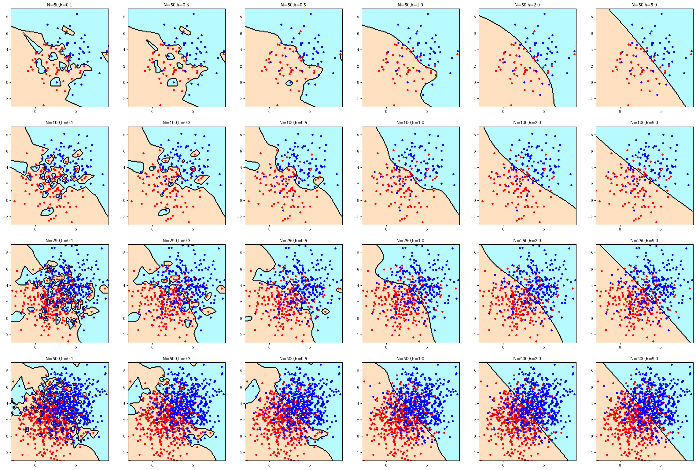 c05_kernel.py(modified in appendix) to obtain plots for \(h = 0.1, 0.3, 0.5, 1, 2, 5\)1 and \(n = 50, 100, 250, 500\) per class. Plot the classifiers over the range \([-3, 9] \times [-3, 9]\) in order to visualize the entire data and reduce the marker size from 12 to 8 to facilitate visualization. Which classifiers are closest to the optimal classifier? How do you explain this in terms of underfitting/overfitting? See the coding hint in part (a) of Problem 5.8.