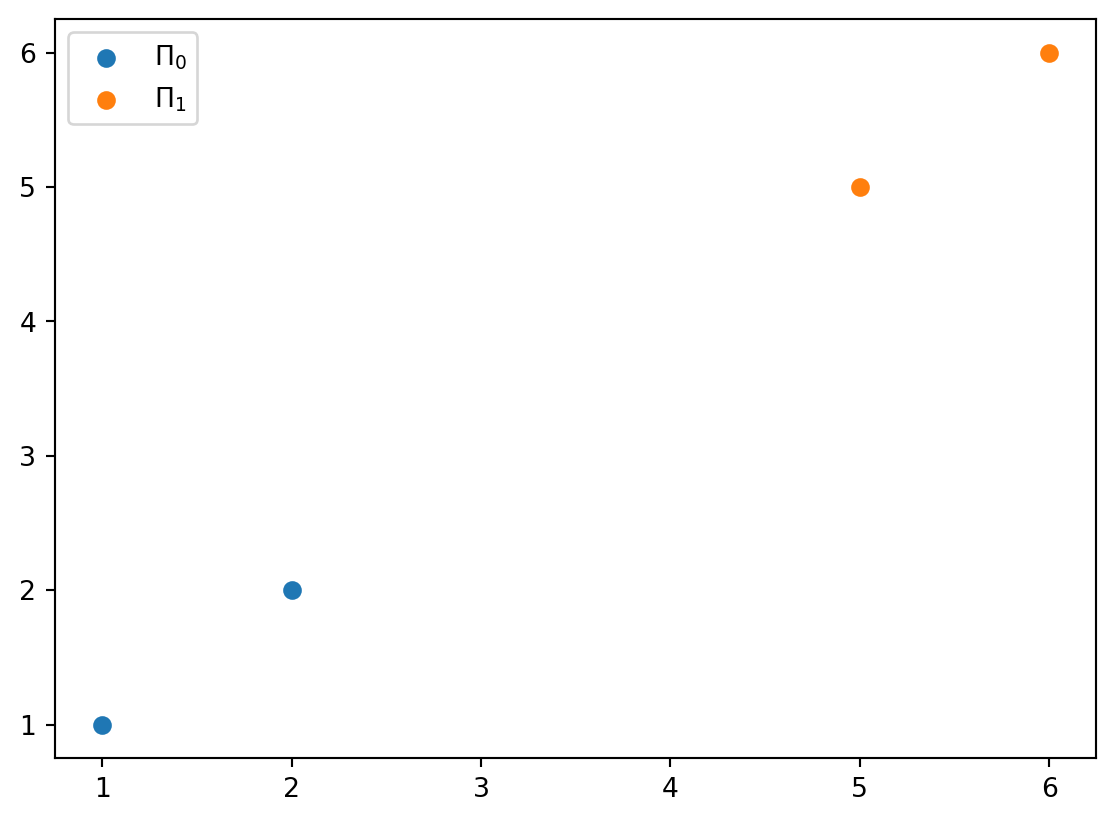 If \(N_0=N_1=2\), the leave-one-out method removes one of the data point. The remaining points will have the majority label and have opposite label to the removed point (Figure 9.4). This flipping causes \(\hat{\epsilon}^l = 1\).