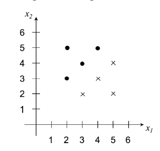 By inspection, find the coefficients of the linear SVM hyperplane \(a_1 x_1 + a_2 x_2 + a_0 = 0\) and plot it. What is the value of the margin? Say as much as you can about the values of the Lagrange multipliers associated with each of the points.
